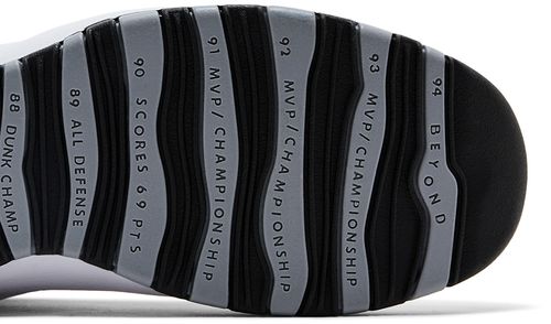 The 2025 edition of the Air Jordan 10 Retro 'Steel' brings back an original colorway of the model designed by Tinker Hatfield to celebrate Michael Jordan's retirement. Laces feed through Steel Grey webbing eyelets to secure the layered white leather upper, contrasted by black leather accents on the collar and eyestay. Embroidered Jumpman branding decorates the back heel. Performance benefits include a Phylon midsole with a top-loaded, full-length Air-sole unit. Underfoot, the rubber outsole displays a teal Jumpman, alongside a list of MJ's ten career milestones.
