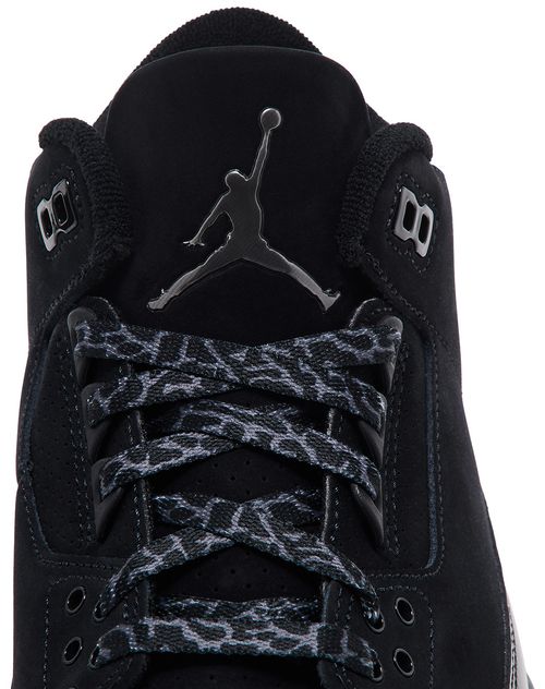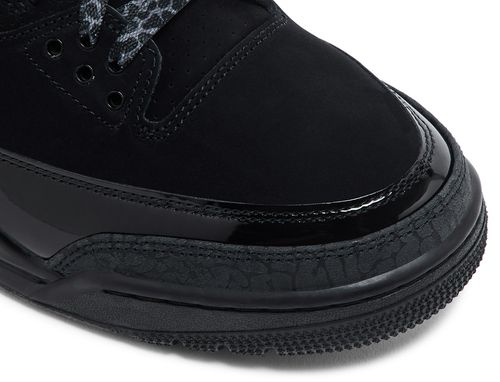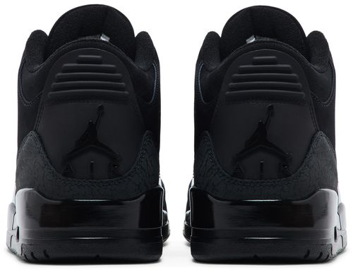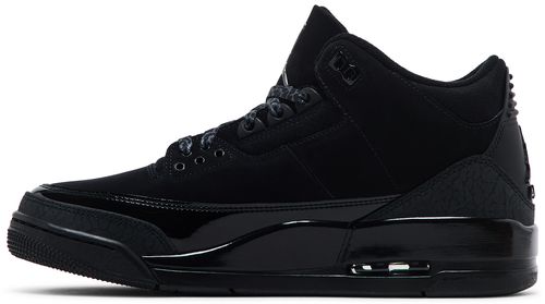 The 2025 edition of the Air Jordan 3 Retro 'Black Cat' brings back a monochrome colorway of the legacy silhouette, named after one of Michael Jordan's many nicknames and originally released in 2007. Built with black nubuck, the upper features a matching black patent leather mudguard and charcoal elephant-print overlays at the forefoot and heel. Jumpman branding adorns the tongue and molded back tab. Lightweight cushioning is provided by a glossy black polyurethane midsole with an exposed Air-sole unit in the heel.