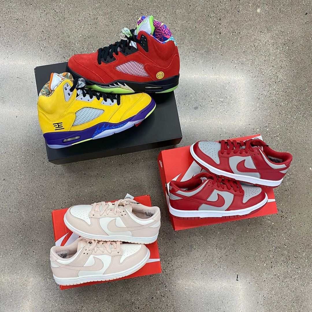 The Air Jordan 5 Retro SE ‘What The’ celebrates the 30th anniversary of the classic silhouette with a mashup design incorporating elements from coveted Air Jordan 5s of years past. Most notably, the right shoe features the yellow suede upper of the ultra-limited ‘Tokyo’ release, complete with stylized ‘23’ on the lateral heel. The left shoe borrows the red suede upper of the ‘Raging Bull’ pack, accented with the ‘Shanghai’ heel emblem. Additional source colorways include the ‘Bel-Air,’ ‘Laser’ and ‘Quai 54’ from 2011.
