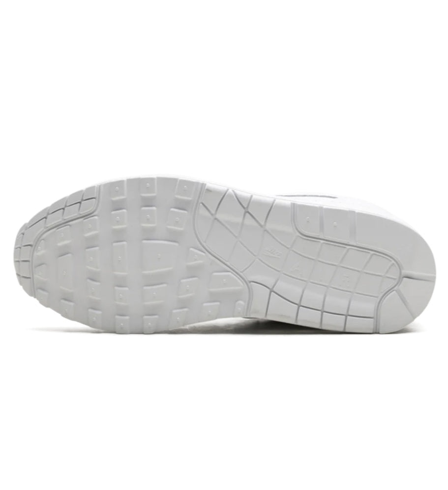 The Supreme x Nike Air Max 1 '87 SP 'Triple White' showcases a white leather upper accented with a snakeskin-textured Swoosh, Supreme lace jewels, and 'World Famous' embroidered on the back heel. A mini-Swoosh adorns the lateral forefoot, while the co-branded tongue tag displays a crimson box logo, bringing a contrasting pop of color to the monochrome design. Anchoring the sneaker is a matching white polyurethane midsole with exposed Air-sole cushioning in the heel.