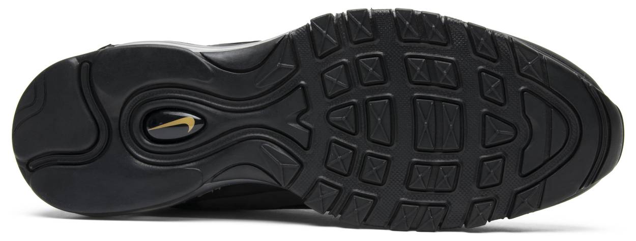 The classic Air Max 97 celebrates its 20th Anniversary with the Nike Air Max 97 ‘Gold Reflective’ sneaker. The ultra-sleek shoe features a leather and mesh upper in an all-black design, including tonal laces, wave detailing, Swoosh branding and outsole. Golden accents can be seen on the tongue, heel counter branding, and inside the Air unit, giving the all-black upper a subtle and sophisticated glow.
