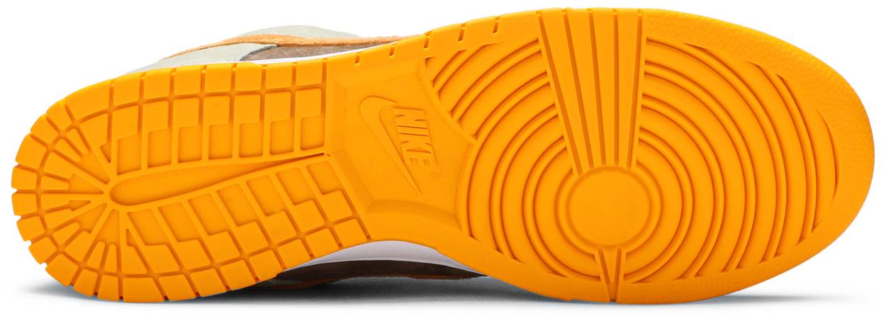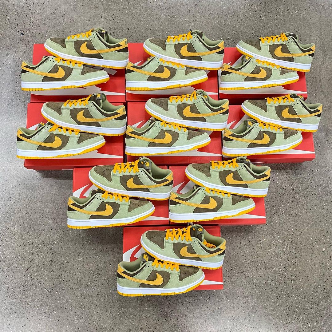 Dressed in a buttery suede build finished in contrasting tones, the Nike Dunk Low ‘Dusty Olive’ could be mistaken for the lost fourth member of Nike’s ‘Ugly Duckling’ pack from 2001. The upper combines a rustic brown base with pale green overlays and bright orange hits on the Swoosh, heel tab and laces. A woven Nike tag decorates the lightly padded tongue, featuring the same brown nylon construction used on the collar. The multi-hued build is offset by a crisp white rubber midsole, which gives way to an outsole that delivers a final pop of color.