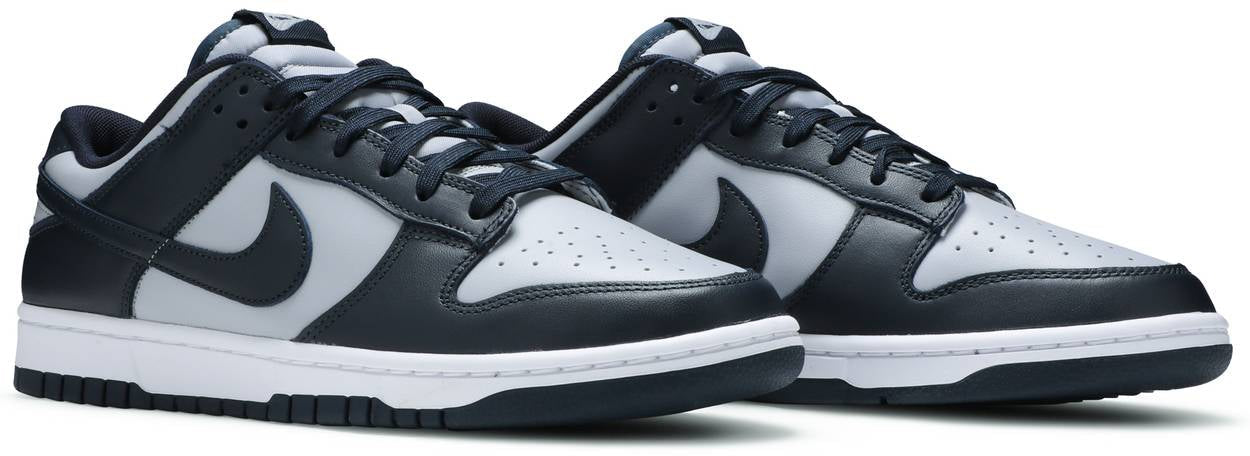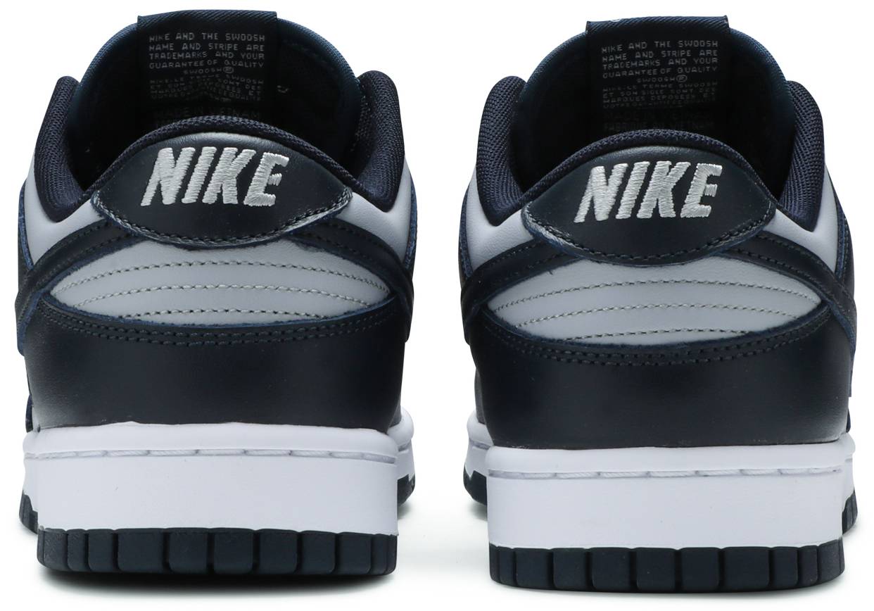 Nike Dunk Low ‘Georgetown’ showcases a simplistic two-tone palette inspired by the Hoyas, arranged in archetypal color blocking that recalls the introductory ‘Be True to Your School’ series from 1985. The leather upper is finished in a neutral grey base with contrasting overlays in a deep navy hue. Exterior branding hits include a woven Nike tongue tag and an embroidered Nike wordmark on the heel tab. The retro hoops shoe is mounted on a durable rubber cupsole, featuring crisp white sidewalls and a navy rubber outsole.