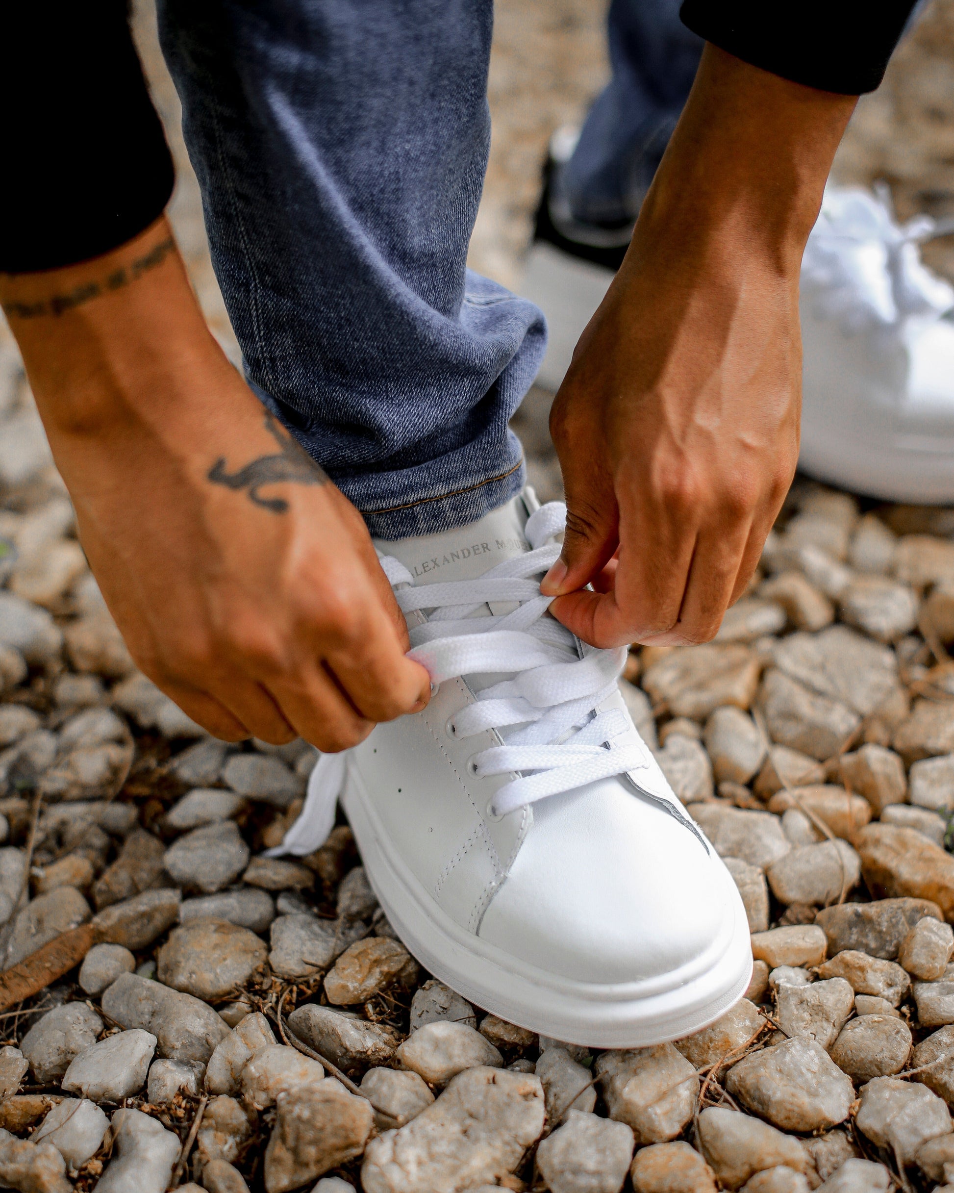 Instantly recognizable by their exaggerated sole, these white and black tone leather sneakers from Alexander McQueen will take your look to the next level. Featuring a lace-up front fastening, a brand embossed tongue, a printed logo at the back, a round toe and an extended white rubber sole, these sneakers can be worn paired with denim for a low key look or dressed up with a slip dress. Alexander McQueen's sneakers are a dependable off-duty necessity. Please note that Alexander McQueen's sneakers no longer come with a dust bag.