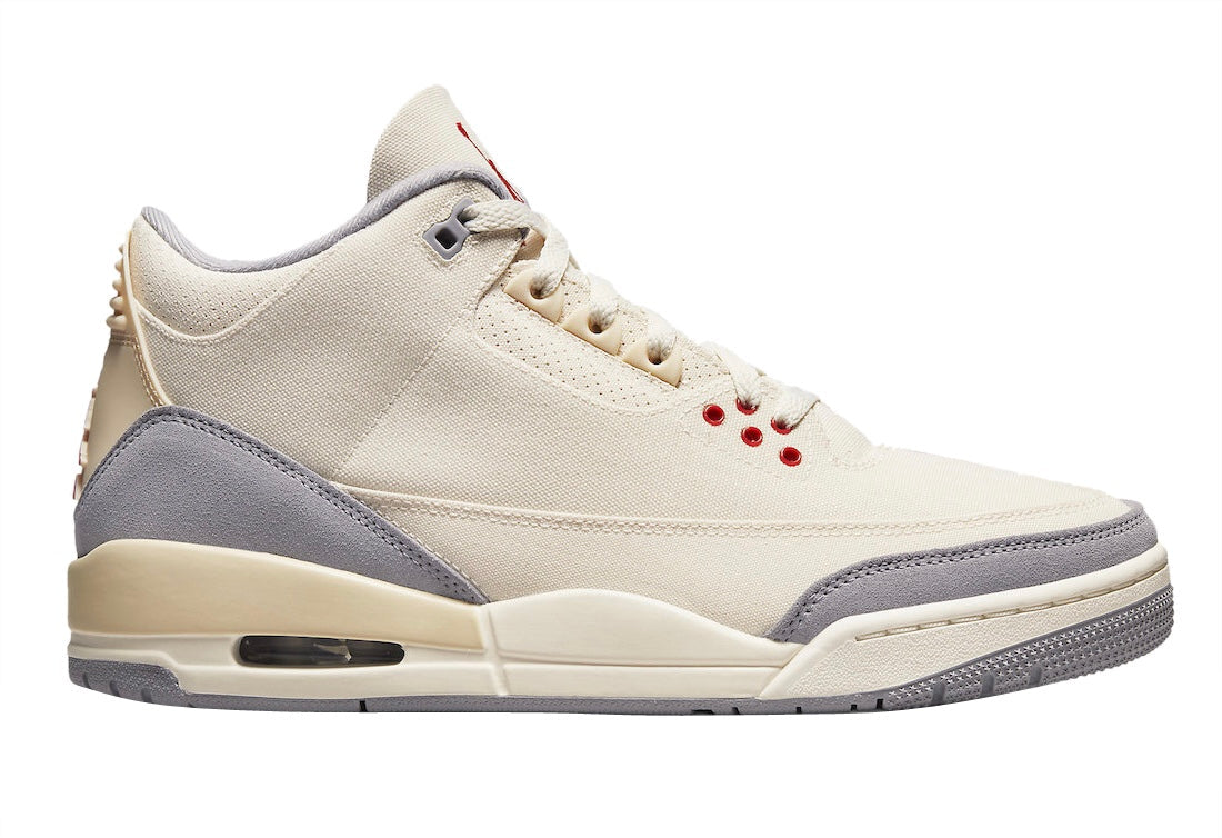 Dressed in an official color scheme of Muslin, University Red, Cement Grey, and Sail, this new Air Jordan 3 gets equipped with a Muslin natural dyed canvas upper instead of the leather we're accustomed to seeing. Cement Grey is then placed on the inner liner and the suede on the heel and toe. University Red, Sail, and Cement Grey then alternate on the eyelets while Sail and Muslin make up the midsole. Red Jumpman logos on the tongue and heel along with a grey rubber outsole cap off the design on this Air Jordan 3