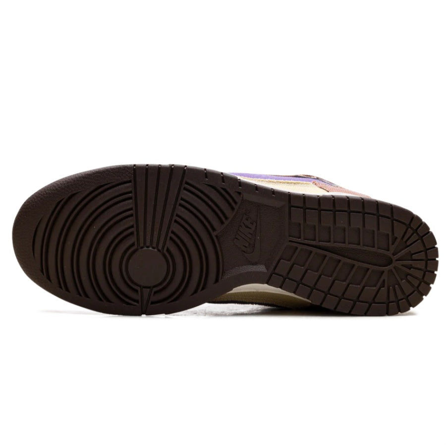 The Nike Dunk Low SE 'Dusted Clay Denim' replaces the traditional leather build with denim-like textile, featuring a flax-colored base with dusty rose overlays at the forefoot and heel. Baroque Brown accents land on the collar lining, Nike tongue tag, and Nike-branded back tab. A cut-out Swoosh reveals a suede underlay in a soft violet hue.