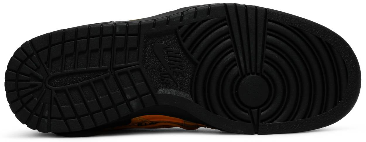 Made in collaboration with Virgil Abloh’s luxury streetwear brand, the Off-White x Nike Air Rubber Dunk ‘University Gold’ showcases a comprehensive reworking of the retro silhouette, highlighted by an upper inspired by the P-6000 runner. A yellow mesh base is fortified with metallic gold leather overlays and an outlined Swoosh. Contrasting black branding, including a ‘Nike Off’ tongue tag and Virgil’s signature Helvetica text on the medial side, is matched by a solid black midsole with visible Air cushioning.