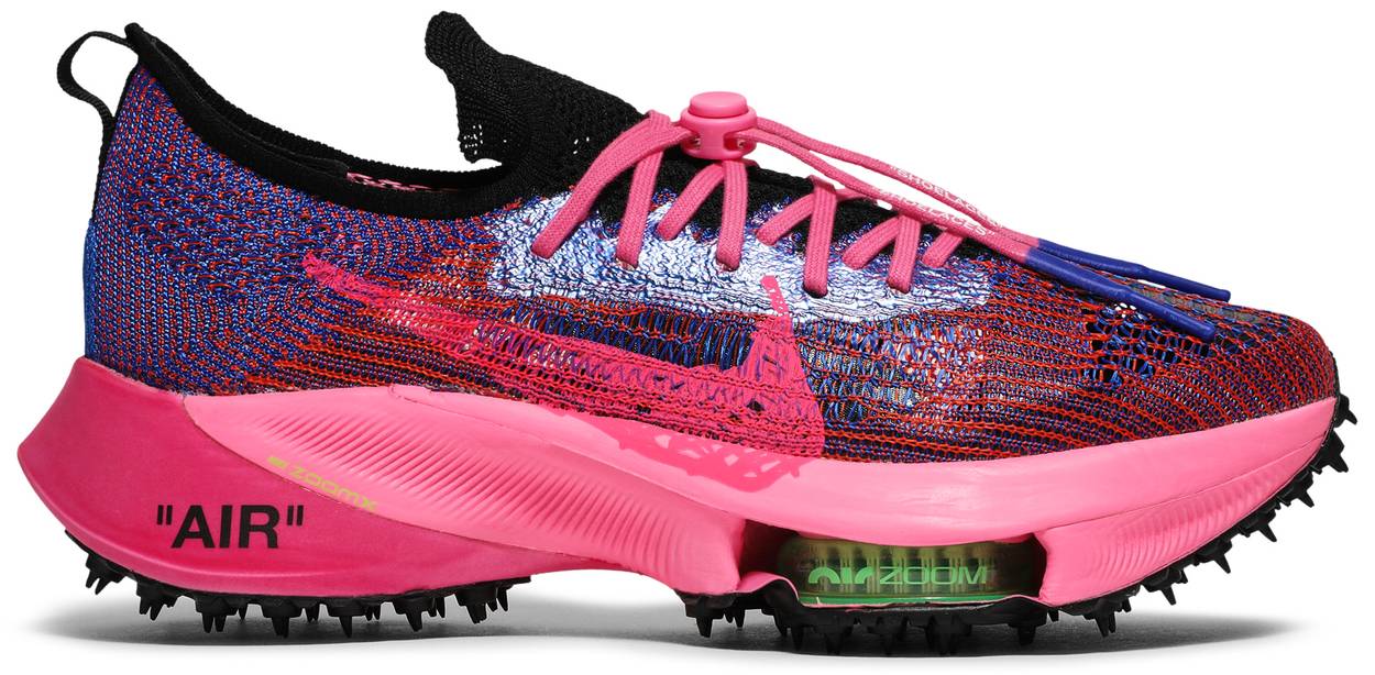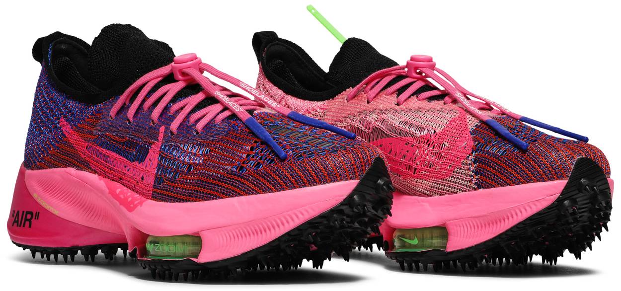 The Off-White x Nike Air Zoom Tempo Next% ‘Pink Glow’ delivers Virgil Abloh’s technicolor interpretation of a pinnacle running shoe. The breathable knit upper features pink paneling on the medial side and mix of red and blue fibers on the lateral side. Large pink Swooshes appear to be painted on, while Virgil’s signature lines of Helvetica text are stenciled across the medial heel. A green plastic zip tie is looped into an asymmetrical lacing system secured with pink lace locks. ‘AIR’ is printed in black lettering on the pink foam midsole, nodding to the green-tinged Zoom Air unit nestled under the forefoot.