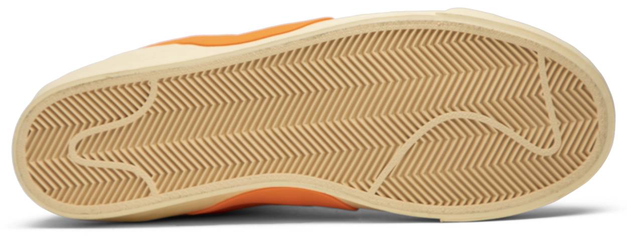 The Off-White x Blazer Mid ‘All Hallows Eve’ showcases a seasonally appropriate orange Swoosh atop a Pale Vanilla base. The yellowish tan hue extends to the exposed-foam tongue and rubber midsole, with the signature zip tie in blue adding a contrasting pop of color. Virgil Abloh’s signature lines of text register an appearance on the medial-side quarter panel.