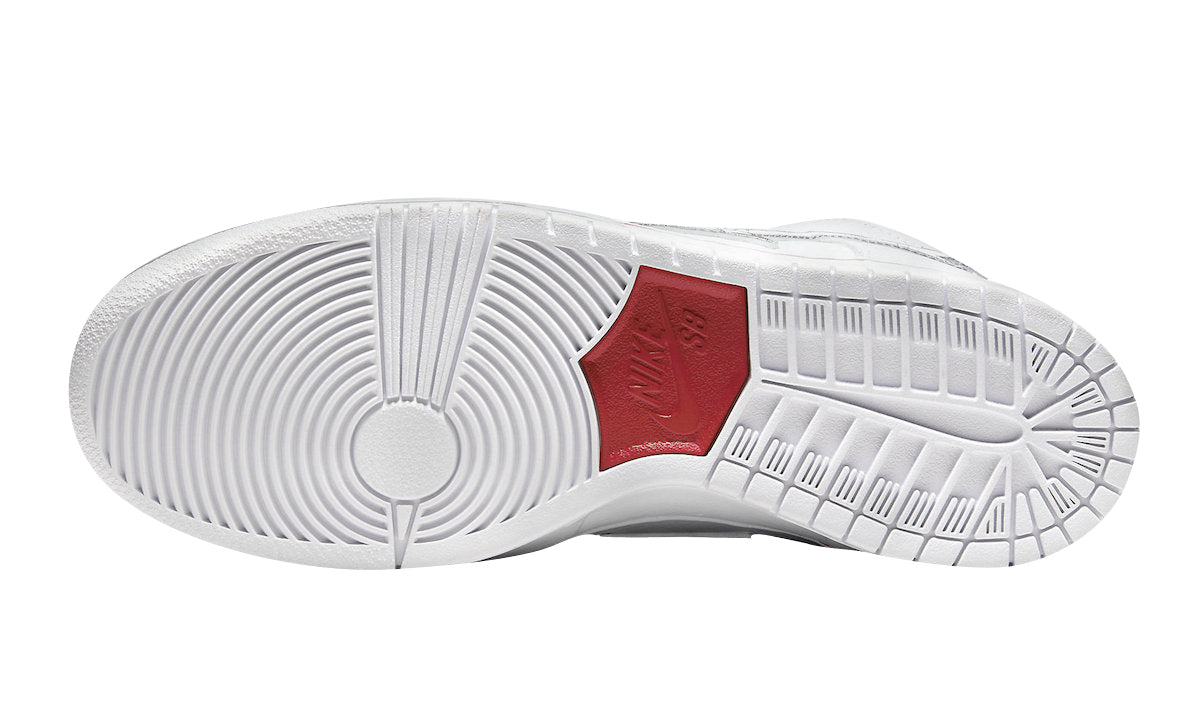 The Oski x Nike SB Dunk High White Shark comes dressed in a White tumbled leather upper paired up with more White on the laces, lining and sole unit. Collab details include the Oski branded tongue labels Shark Swoosh patch noted on both sides of the sneaker. Hits of Red on the stitching on the sole and dual branding on the tongue round out the main features of the sneaker.