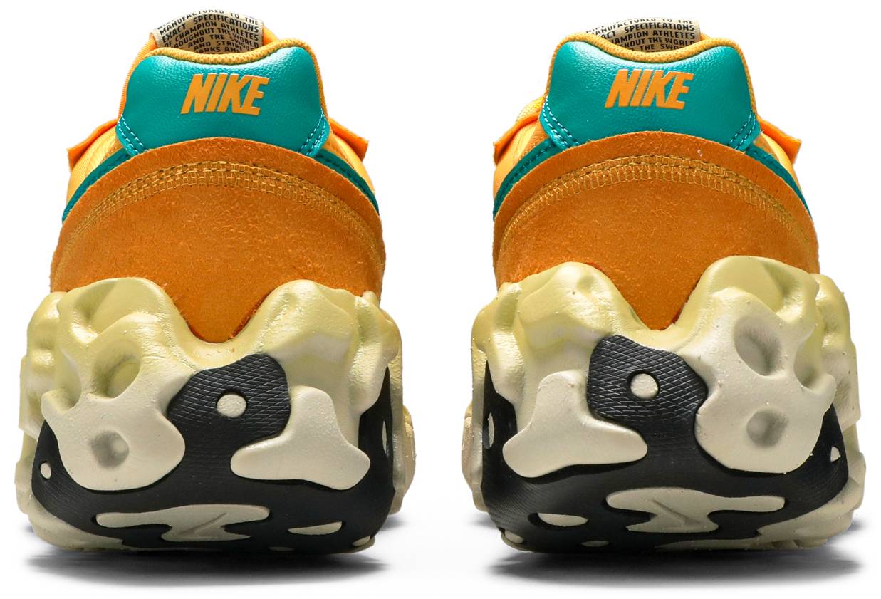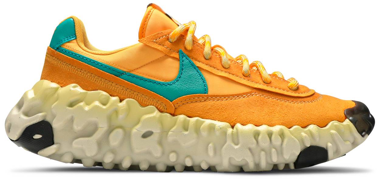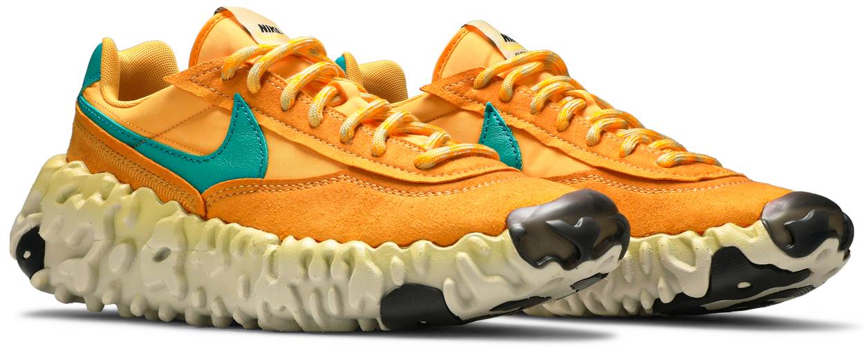 The Nike Overbreak SP ‘Pollen Rise’ showcases a vibrant finish on a lifestyle silhouette that combines vintage running style with ultra-modern tooling. The sneaker’s orange textile upper is reinforced with translucent toe cap and tonal suede overlays rendered in a subtle gradient finish. Contrasting green leather is utilized on the heel tab and oversized Swoosh. The sneaker rides on a sculpted React foam midsole borrowed from the Nike OverReact.
