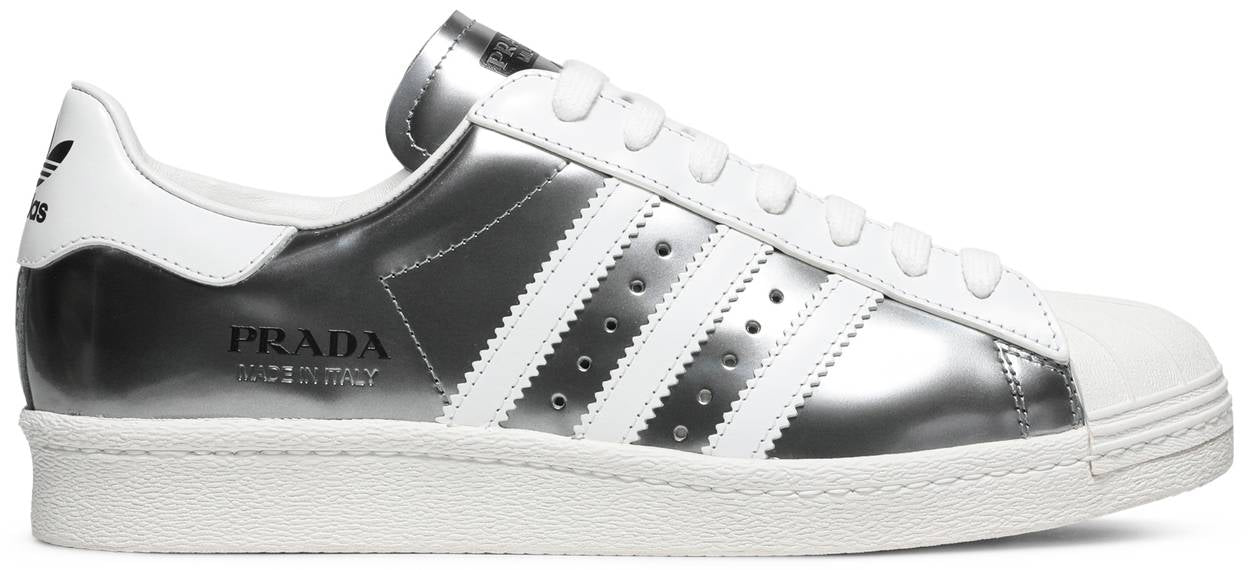 Designed in partnership with the luxury fashion house, the Prada x adidas Superstar ‘Silver Metallic’ is manufactured in Italy with premium materials. A shiny metallic silver finish is executed on the genuine calfskin leather upper, accented with white leather detailing on the eyestay, heel tab and signature three-stripes. A rubber shell toe maintains the classic Superstar aesthetic. Prada logo hits appear on the leather sockliner, tongue and lateral heel.