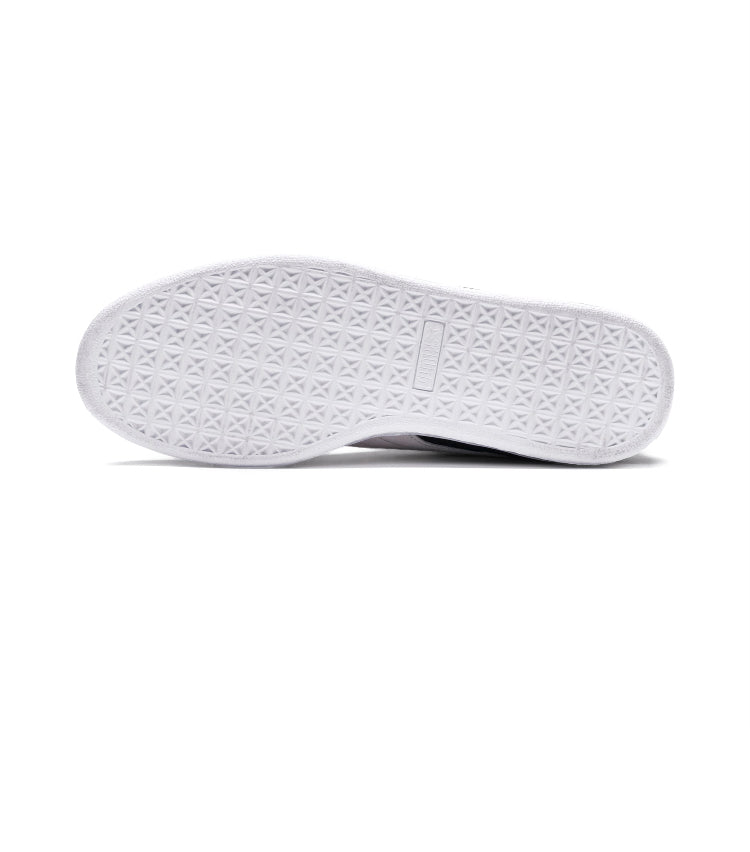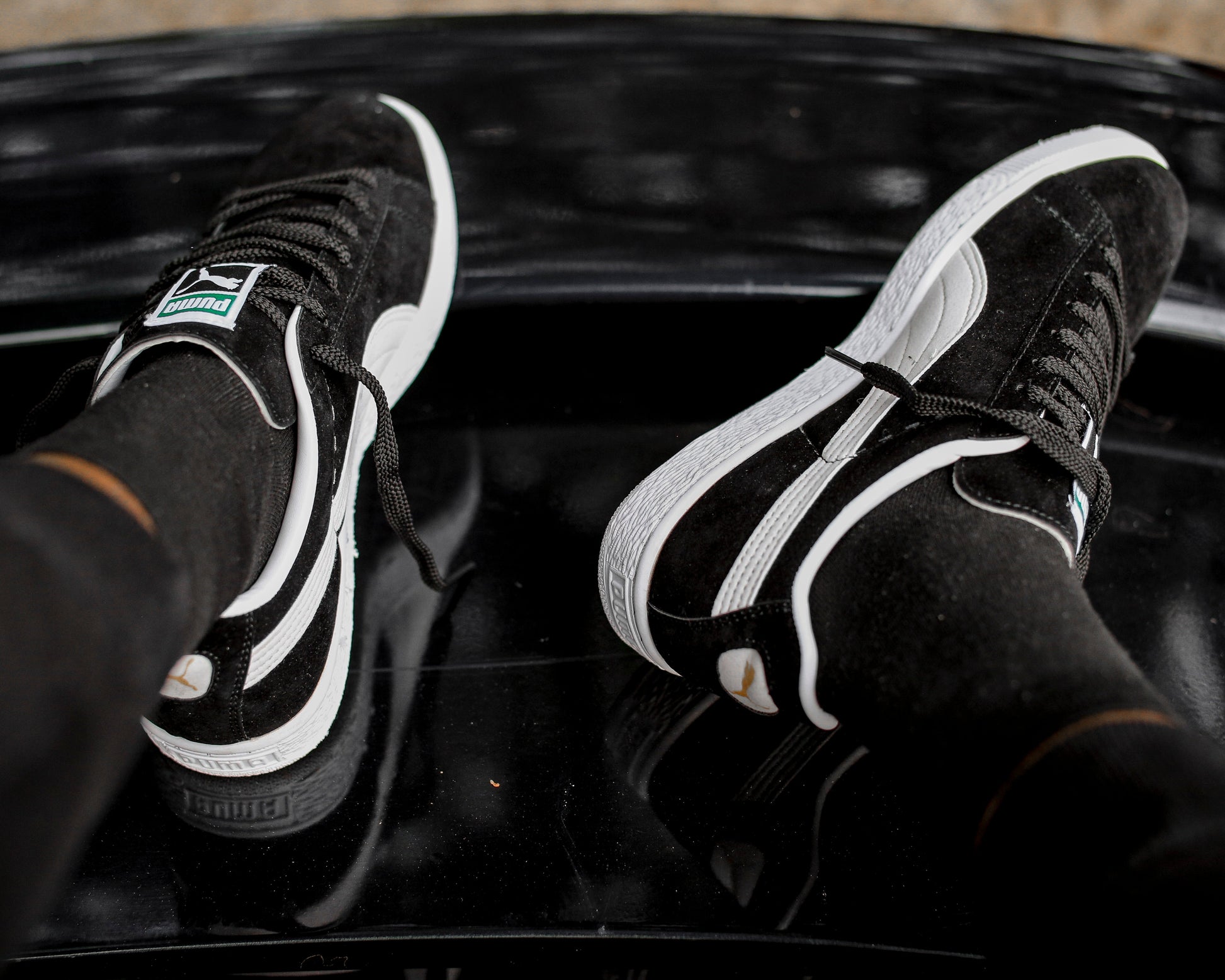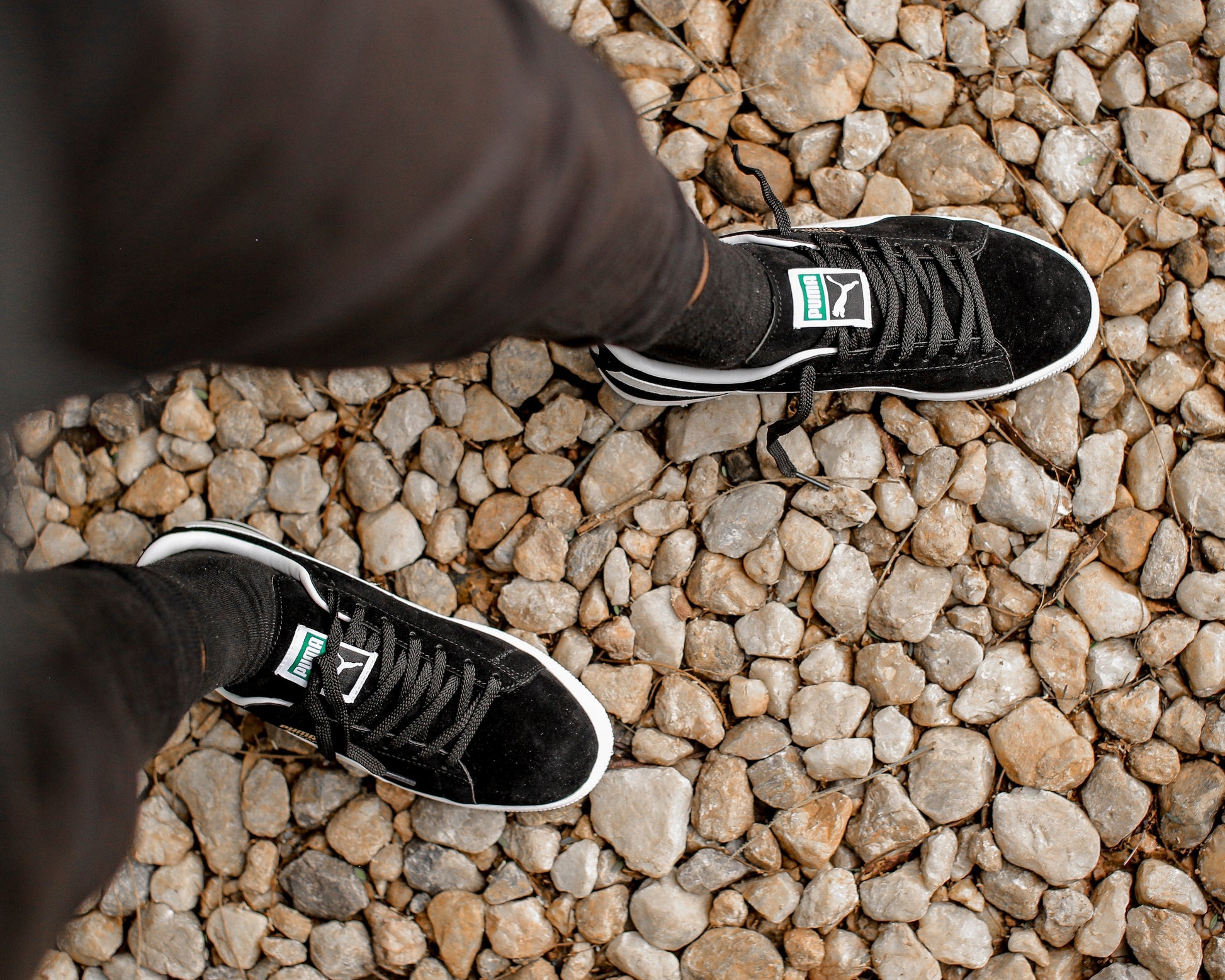 An iconic breakdancing shoe in the 70s and 80s, the Puma Suede has since become a lifestyle classic. This iteration features a low-profile design constructed with black suede panels up top and contrasting beige and gold accents on the branding. Retro Puma logos line the tongue and footbed, while a vulcanized white midsole allows for a versatile look that complements a variety of wardrobe styles.