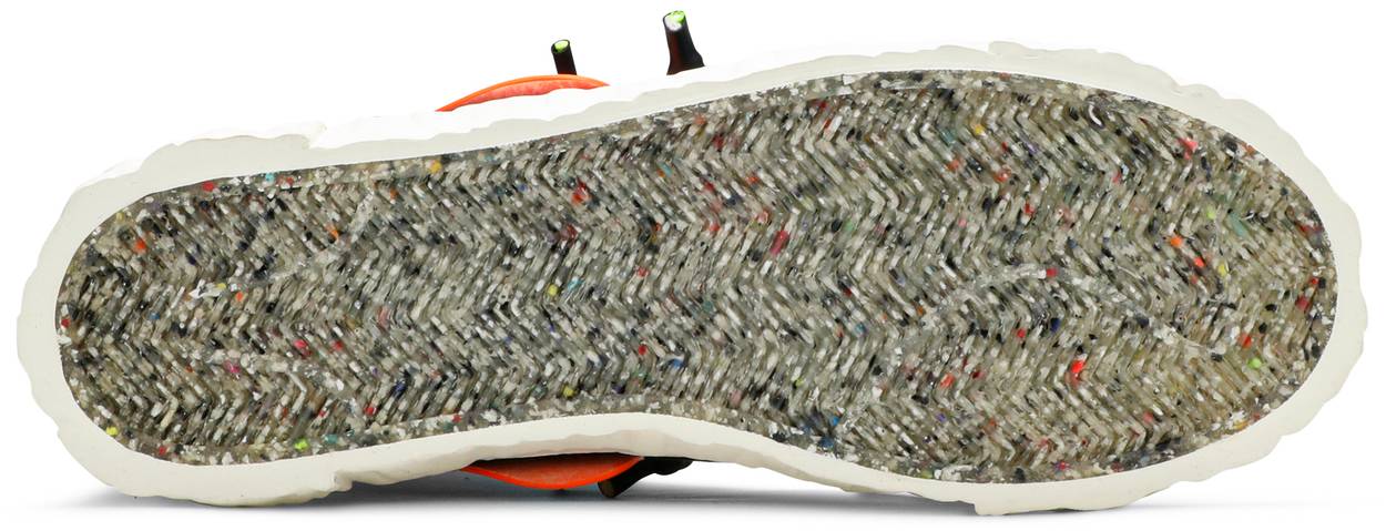 Designed in partnership with Yuta Hosokawa’s menswear brand, the READYMADE x Nike Blazer Mid ‘Black Camo’ reinvents the retro hoops shoe as a DIY assemblage of leftover pieces. Multiple laces secure an upper built with camo-like textile, overlaid with unfinished quarter panels and a distorted orange Swoosh that wraps around the READYMADE branded heel. Exposed foam on the tongue and collar adds to the sneaker’s deconstructed look. A bumpy texture distinguishes the rubber midsole, which gives way a herringbone traction outsole made with recycled Nike Grind material.