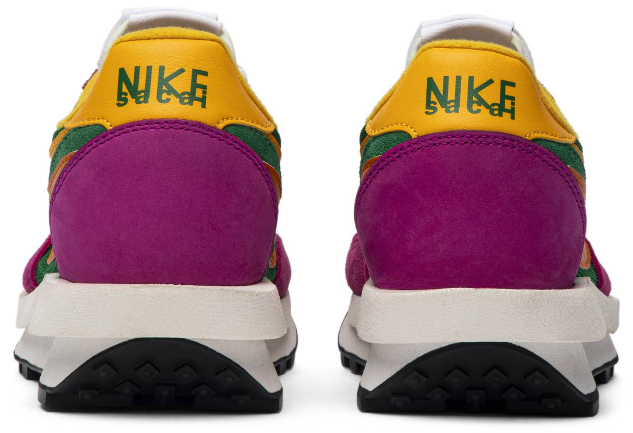 The Sacai x LDWaffle fuses the Japanese label's experimentalism with Nike's heritage ingenuity. Unveiled in September 2019, this 'Pine Green' edition updates the hybrid model in a vibrant color story. Its mesh upper sees layered suede eyestays, double reinforcements and dual, two-tone Swooshes. The aesthetic is furthered by twin tongues, optional double laces and stacked heel logos. Its double stacked, sculpted midsole follows the same formula atop a rubber waffle tread.