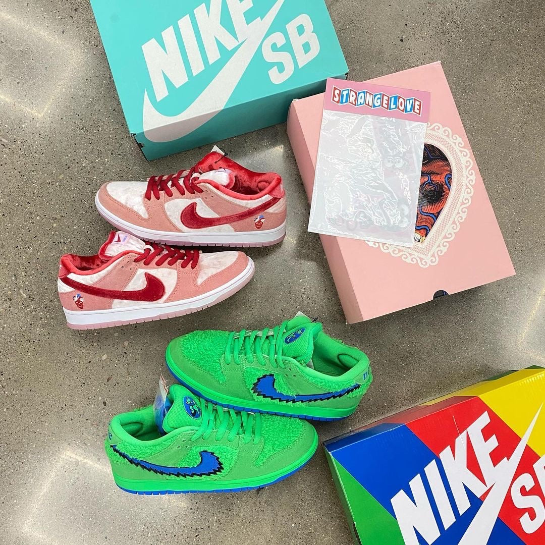 The Grateful Dead x Nike SB Dunk Low “Green Bear” is one of three extremely sought after colorways from the California based rock band’s collaboration with Nike SB. Nike SB produced a swarm of exciting new and original designs in 2020 that incorporate elements outside of the realm of sneaker culture, with the trio of Grateful Dead Dunks heading the lineup. The two-toned appearance of the upper features green faux fur on the toe, mid-panel, and heel as a direct reference to the band’s marching bears characters commonly seen on various artworks for Grateful Dead albums and merchandise. The motif reappears in a multicolor design on the insole. Tonal suede overlays dot the forefoot, eyelets, and heel. Branding appears in the form of a contrasting blue jagged Swoosh on the mid-panel, blue Nike embroidery on the heel, and a mini marching bear and Swoosh logo inside of an emblem on the tongue. One final detail of note, the hidden stash pocket located on the inside of the tongue displays the band's "Steal Your Face" skull.
