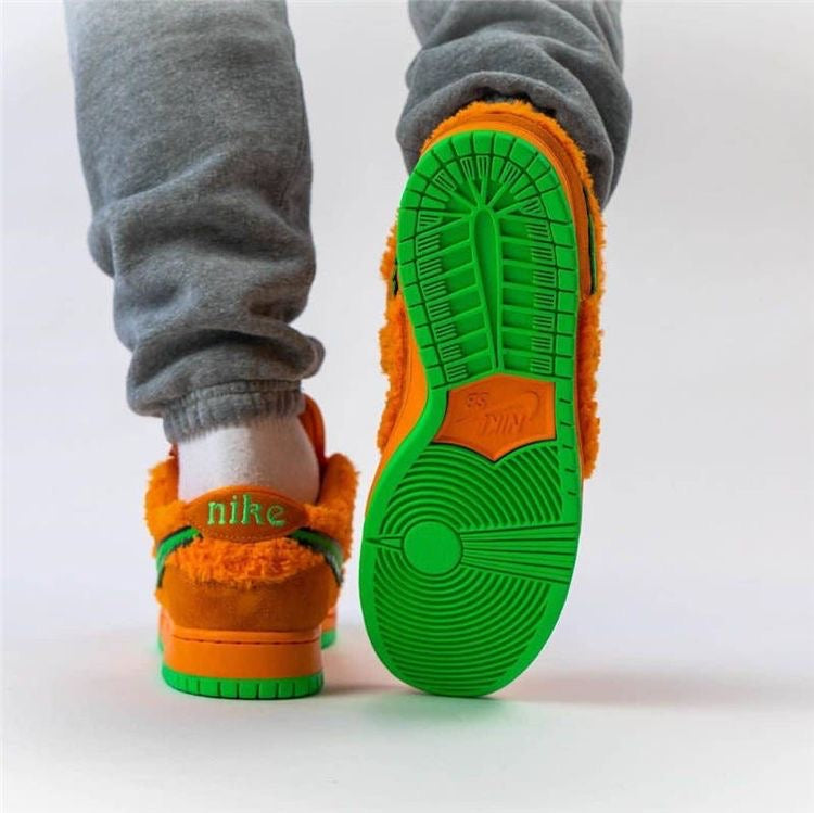 The Grateful Dead x Nike SB Dunk Low “Orange Bear” is a limited edition colorway of the California based rock band’s collaboration with Nike SB that was released exclusively at FTC Skate Shop. One of three extremely rare and desirable Dunks made in collaboration with the Grateful Dead, this “Orange Bear” design is the rarest of all. It represents the Bay Area thoroughly with its orange-based appearance. The two-toned appearance of the upper displays orange faux fur on the toe, mid-panel, and heel as a reference to the band’s marching bears characters commonly seen on various artworks for Grateful Dead albums and merchandise. The lovable bears reappear on the insole. Tonal suede overlays can be found on the forefoot, eyelets, and heel. A contrasting jagged green Swoosh covers the mid-panel and green Nike embroidery dots the heel. A final detail worth mentioning is the hidden stash pocket located on the inside of the tongue, which displays the band’s “Steal Your Face” skull.