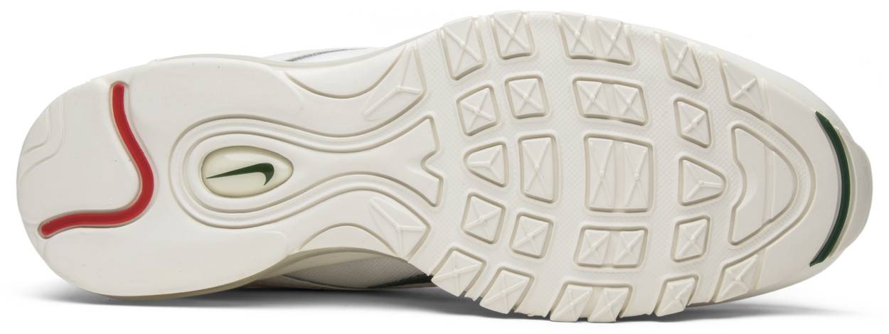 The Undefeated x Air Max 97 OG 'Sail' pays tribute to Italy's special relationship with the Air Max 97. The Gucci-inspired design features a white-based upper, white patent leather mudguard, and a Gucci-inspired Gorge Green/Speed Red wavy side panel stripe. Undefeated branding runs the length of the red stripe, and the brand's tally logo hits up the insole. Released in September 2017 alongside a 'Black' colorway, the sneaker celebrates the 20th anniversary of the Air Max 97 and the LA boutique's 15th year serving West Coast sneakerheads.