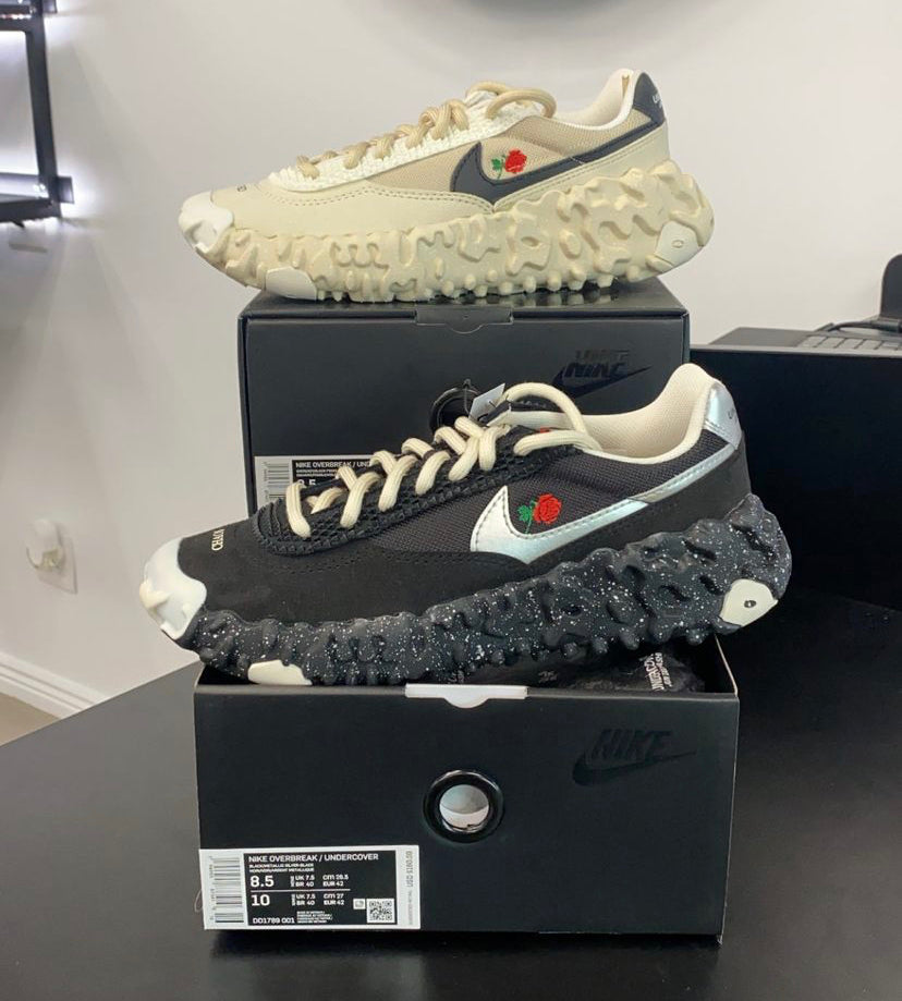 The Undercover x Nike Overbreak SP ‘Black’ draws from design concepts introduced in the Japanese brand’s Spring/Summer 2021 collection. The sneaker makes use of a black textile upper, accented with a metallic silver Swoosh and an embroidered red rose graphic on the lateral quarter panel. Tonal synthetic suede overlays reinforce the heel and forefoot, the latter featuring ‘Chaos’ and ‘Balance’ printed atop the right and left shoe. Speckled detailing is dusted on a molded React foam midsole that recalls the Nike Overreact.