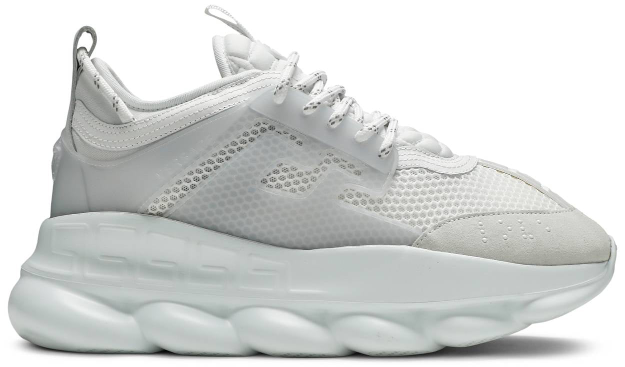 The Chain Reaction sneaker represents Versace's flamboyant spirit with progressive elements reinterpreting house iconography. Debuted in June 2019, this update has been designed with a white mesh upper given a tonal suede toe, dipped laces and a cloudy Greca cage. A Medusa head on the heel and Greek key pattern across the vamp nod to the label's Italian heritage. Referencing iconic Versace chain jewelry, the exaggerated rubber sole affords dramatic height.