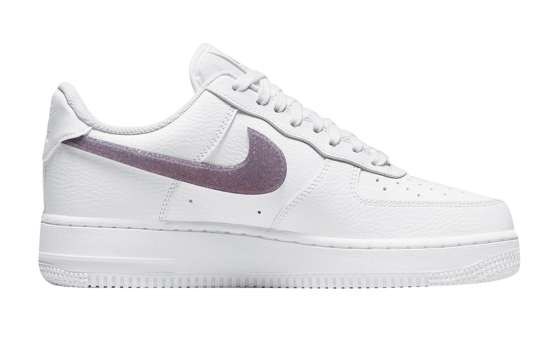 This iteration of the Nike Air Force 1 Low starts off with a White tumbled leather upper complimented by the Grey Nike branding on the tongue tag and the debossed Nike Air hits on the heels. The most unique feature on the sneaker is without a doubt the Purple glitter Swooshes on the sides that seamlessly give the sneaker some added pop. Additional White on the laces, lining and sole unit complete the look.