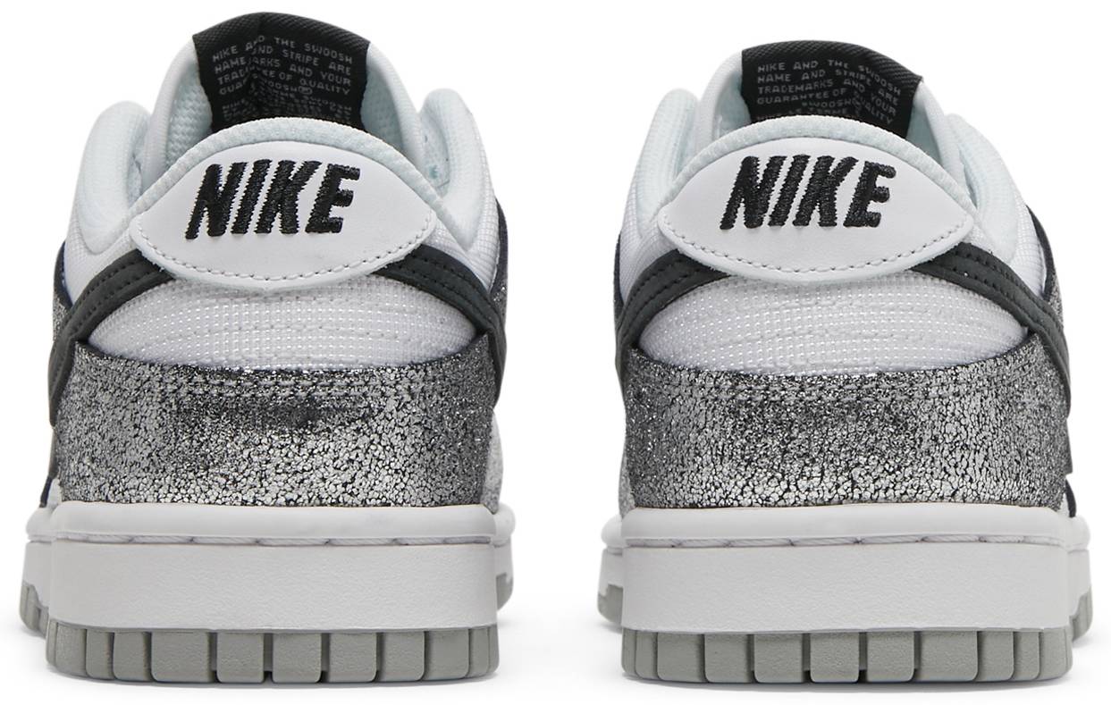 The Nike women’s Dunk Low ‘Golden Gals’ treats the retro hoops shoe to a shimmering makeover. Silver-tone laces secure the upper, featuring a white textile base with forefoot and heel overlays in metallic silver-flake leather. Contrasting black accents land on the Swoosh and woven tongue tag, as well as the Nike wordmark embroidered on the leather heel tab. The low-top sits on a standard rubber cupsole, featuring crisp white sidewalls and a grey rubber outsole.