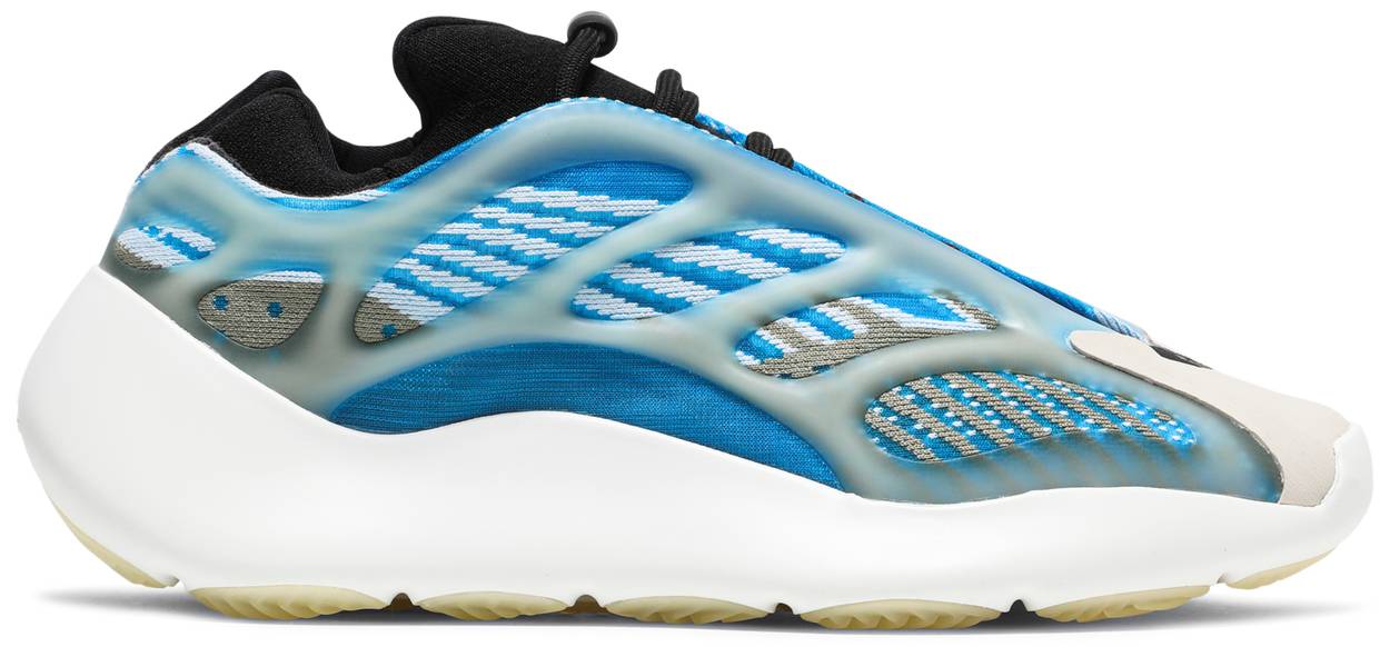 The adidas Yeezy 700 V3 ‘Arzareth’ features vibrant blue tones on a breathable knit upper, its side panels overlaid with a semi-translucent RPU cage for added structure and durability. Contrasting black is applied to the sneaker’s bootie-style collar, good for a snug fit around the ankle. The sneaker rides on a PU encapsulated EVA midsole, reinforced underfoot by a herringbone rubber outsole for grippy traction.