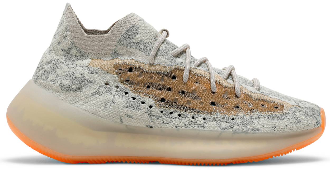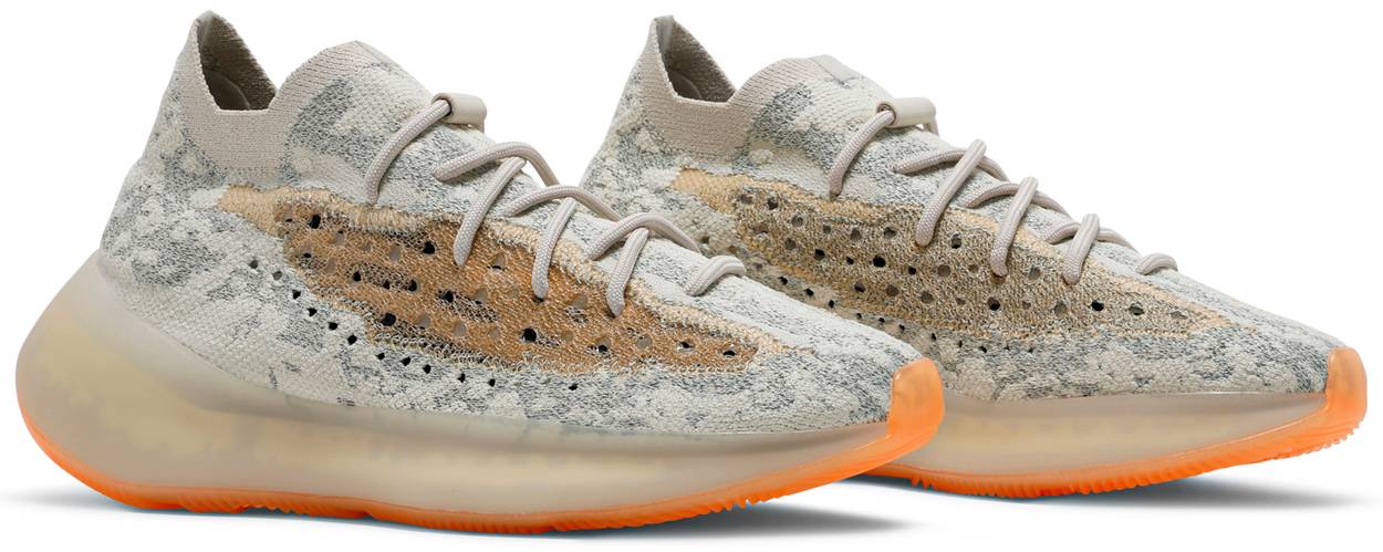 The adidas Yeezy Boost 380 ‘Yecoraite’ carries a flexible Primeknit upper embellished with a camo-like pattern made up of neutral grey and off-white fibers. The minimalist sock-like build is accented with decorative laces and a translucent monofilament window in a pale orange hue. Responsive cushioning is provided by a full-length Boost midsole, encased in semi-translucent rubber for improved stability and durability. A subtle coral finish is applied to the herringbone rubber outsole.
