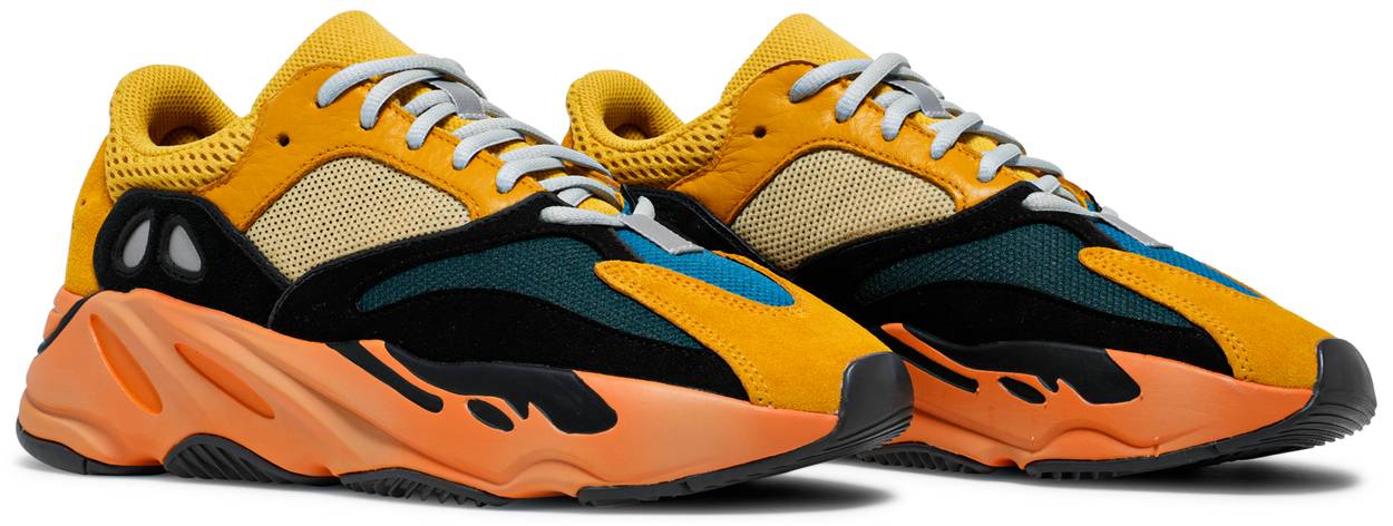 The adidas Yeezy Boost 700 ‘Sun’ treats the lifestyle runner to a lively color scheme that accentuates the silhouette’s multi-layered build. The majority of the mesh and leather upper is rendered in varying shades of yellow, contrasted by a black suede overlay that extends to mesh forefoot panels in blue and teal. A clashing coral finish is applied to the bulky midsole, featuring full-length drop-in Boost cushioning for a smooth ride. Underfoot, a herringbone rubber outsole delivers optimal grip.